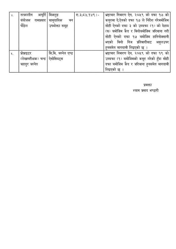 त्यस्तै तत्कालीन आपूर्ति संयोजक रामप्रसाद पौडेलविरुद्ध ३ लाख ८४ हजार १४९ रुपैयाँ र लेखापरीक्षक चन्द्रबहादुर बस्नेतविरुद्ध पनि मुद्दा दर्ता गरेको छ ।