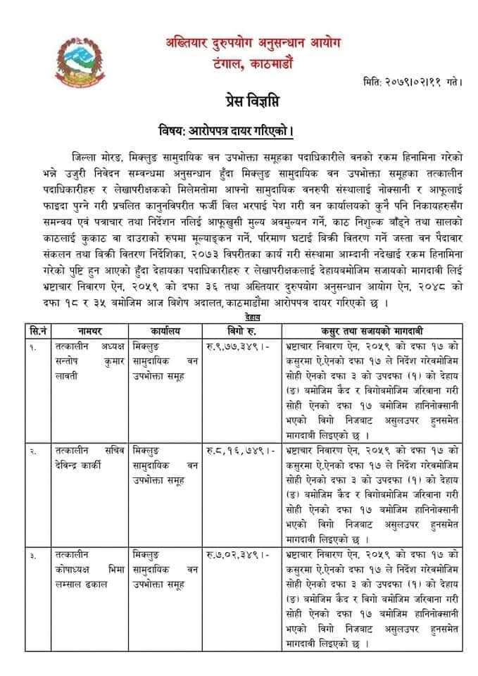 वन उपभोक्ता समूहका तत्कालीन पदाधिकारीहरू र लेखापरीक्षकको मिलेमतोमा सामुदायिक वनरुपी संस्थालाई नोक्सानी र आफूलाई फाइदा पुग्ने गरी काम गरिएको ठहर गरेर अख्तियार दुरुपयोग अनुसन्धान आयोगले भ्रष्टाचार मुद्दा दर्ता गरेको हो ।