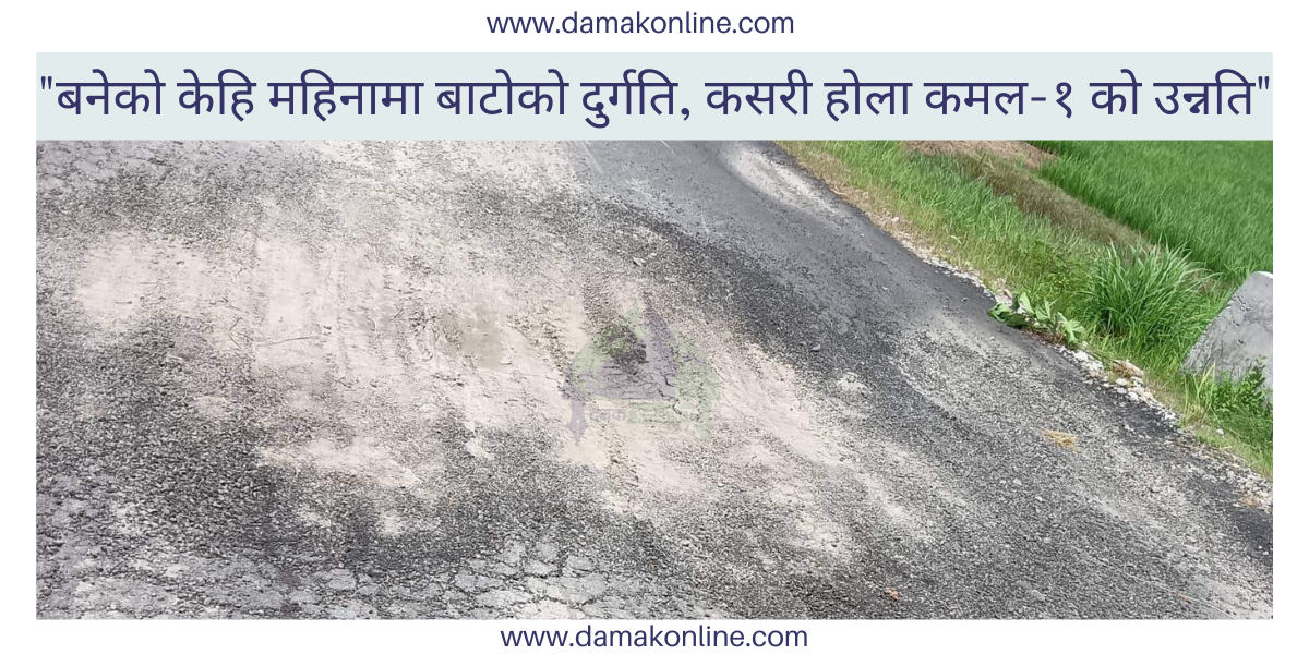 केहि दिन अघि दमक अनलाइनको टिम कमल गाउपालिका घुम्ने क्रममा थियो। हिड्दै गर्दा हामी कमल १ बासबारी तिर थियौ । काम बिशेषले सुनहारा जाँदै गर्दा हामी दृश्यमा देखिएको बाटो हुँदै लाग्यौ । यो बाटो केही समयमात्र अघि बनिएको स्थानीय युवाहरुको भनाइ थियो। उनिहरुका अनुसार ” काम सम्पन्न भएको केही समयमा नै यो बाटो यसरी खाल्डा परेको छ। हामीले भनेको पनि कसले सुन्ने हो र? अनि उजुरी गर्ने पनि कसलाई? हामीले चिन्ने त स्थानिय जनप्रतिनिधिहरुलाइ नै हो।