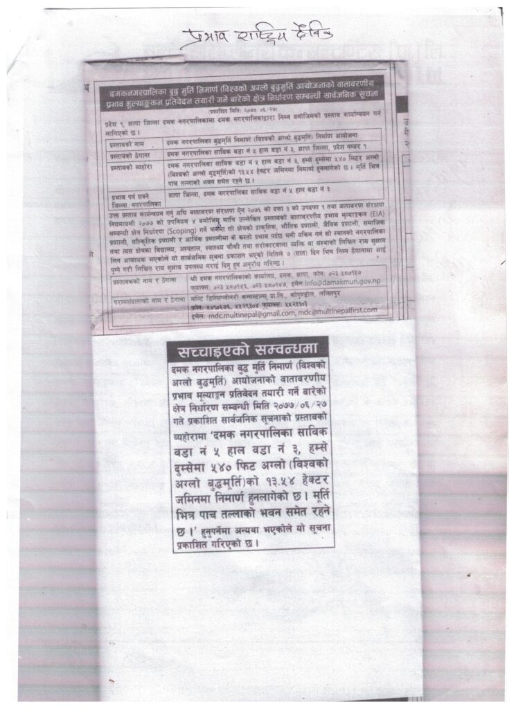 दमक नगरपालिका बुद्धमूर्ति निर्माण (विश्वको अग्लो बुद्धमूर्ति) आयोजनाको वातावरणीय प्रभाव मूल्याङ्कन प्रतिवेदन तयारी गर्ने बारेको क्षेत्र निर्धारण सम्बन्धी सार्वजनिक सूचना ।