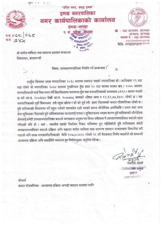 नगरपालिकाको पूर्वी सिमानामा तर्फ रतुवा खोला र सो को पूर्व तर्फ झापा जिल्लाको कमल गाँउपालिका रहेको छ । दुवै पालिकाको सिमानामा पर्ने रतुबा नदीको वहावक्षेत्र एउटै भएको समान भौगोलिक अवस्थिति र वजार तथा अन्य सेवा सुविधाका हिसावले दुवै पालिकाहरुका जनतालाई पायक र सुविधाजनक भएका कारण दुवै पालिकाको भौगोलिक क्षेत्रलाई समेटी उपमहानगरपालिका बनाउने प्रस्ताव अघि सारिएको हो । जनचाहना अनुरुप गत विगत वर्षहरुमा नै उपमहानगरपालिका बनाउने पहल गरिएको पनि हो । स्थानीय तहको निर्वाचन निकट भविष्यमा हुन गईरहेकोले दुवै पालिकाहरु समेटी उपमहानगरपालिका बनाउने प्रक्रिया अघि बढाउन संघीय मामिला तथा सामान्य प्रशासन मन्त्रालयमा सिफारिस गरी पठाउने भनि दमक नगरकार्यपालिकाको मिति २०७८/०४/२८ गतेको ९६ औ बैठकबाट निर्णय भएकोले सो सम्बन्धी आवश्यक प्रक्रिया अघि बढाईदिनुहुन दमक नगरपालिकाले संघीय मामिला तथा सामान्य प्रशासन मन्त्रालयलाई लिखित रुपमा अनुरोध गरेको छ।