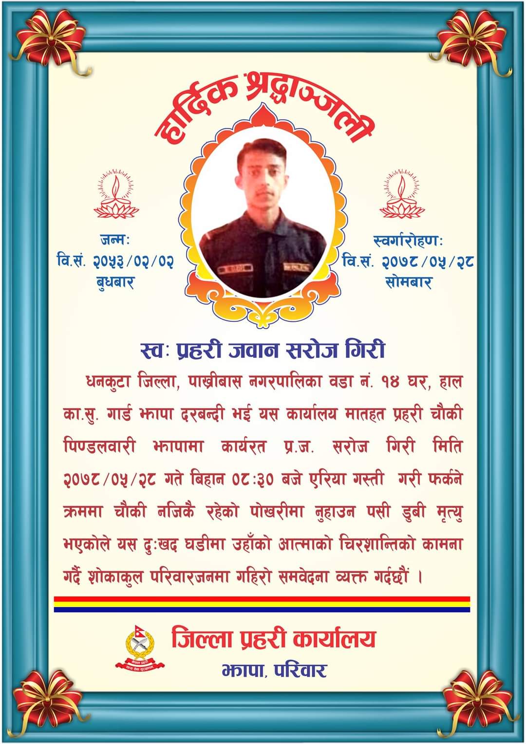 कचनकवल–१ मा अवध राजवंशी सहित ८ जनाको लगानीमा निर्माण गरेको पोखरीमा नुहाउने क्रममा उनको मृत्यु भएको हो । धनकुटा पाख्रीबास १४ घर भई प्रहरी चौकी पिन्डलबारीमा कार्यरत गिरी एरीया गस्ति गरी फर्कने क्रममा चौकी नजिकै रहेको पोखरीमा नुहाउन पसेका थिए । सोही पोखरीमा डुवेर उनको मृत्यु भएको छ ।