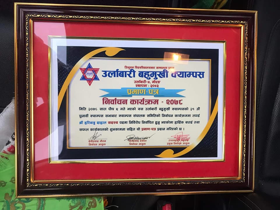 यही मिति २०७८ साल पौष ९ गते भएको यस उर्लाबारी बहुमुखी क्याम्पसको २१ औं चुनावी क्याम्पस सभाबाट क्याम्पस सञ्चालक समितिको सदस्य पदमा डा.हरिबाबु दहाल निर्विरोध निर्वाचित हुनु भएको छ।