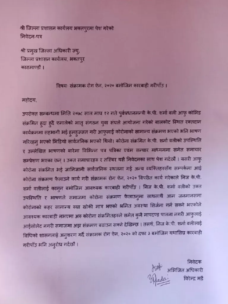 नेकपा एमालेका अध्यक्ष केपी शर्मा ओलीलाई कारबाही गर्न माग गर्दै उजुरी परेको छ । संक्रामक रोग ऐन २०२० विपरीत कार्य गरेको भन्दै सूर्यविनायक नगरपालिका भक्तपुरका अभिजित अधिकारीले जिल्ला प्रशासन कार्यालय भक्तपुरमा अध्यक्ष ओलीविरुद्ध उजुरी हालेका हुन् ।