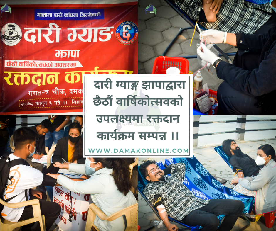 यही अवसरमा दारी ग्याङ्ग झापाले झापाको दमकस्थित गणतन्त्र चोकमा रक्तदान कार्यक्रम सम्पन्न गरेको छ।