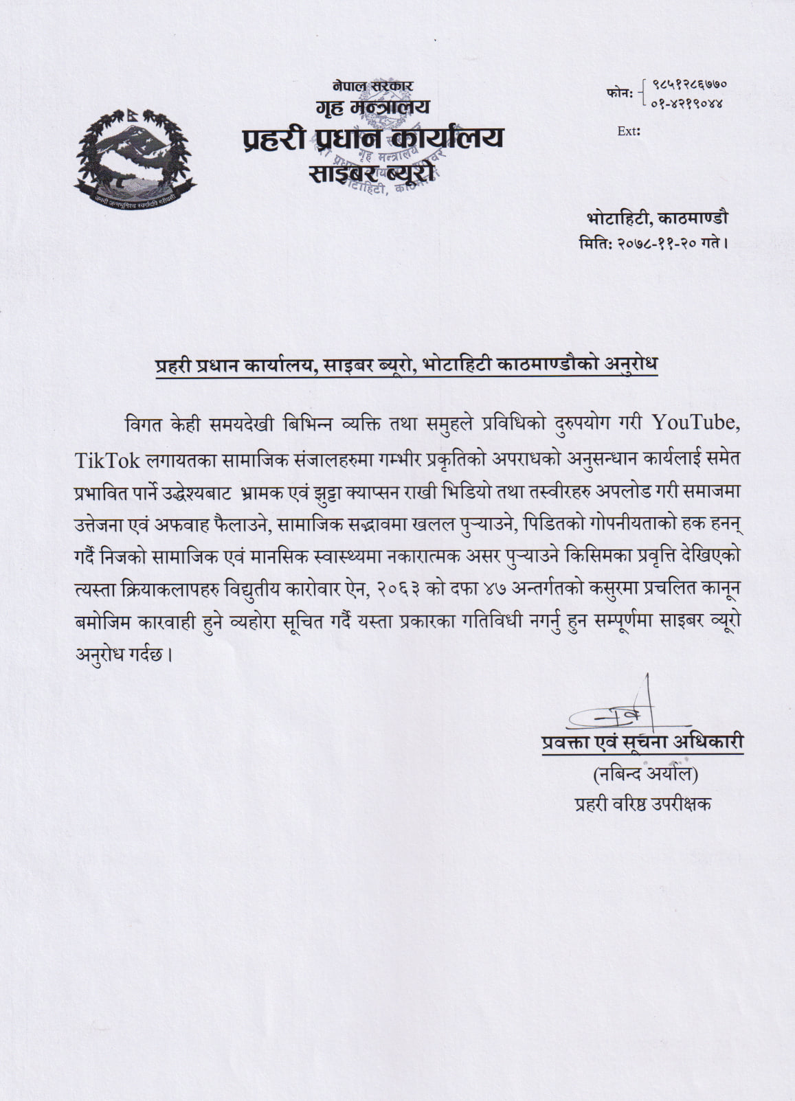 ‘विगत केही समयदेखि विभिन्न व्यक्ति तथा समूहले प्रविधिको दुरुपयोग गरी युट्युब, टिकटक लगायतका सामाजिक सञ्जालहरुमा गम्भीर प्रकृतिको अपराधको अनुसन्धान कार्यलाई समेत प्रभावित पार्ने उद्देश्यबाट भ्रामक एवं झुट्टा क्याप्सन राखी भिडियो तथा तस्बिरहरु अपलोड गरी समाजमा उत्तेजना एवं अफवाह फैलाउने, सामाजिक सद्भावमा खलल पुर्‍याउने, पीडितको गोपनीयताको हक हनन् गर्दै निजको सामाजिक एवं मानसिक स्वास्थ्यमा नकारात्मक असर पुर्‍याउने किसिमका प्रवृत्ति देखिएको त्यस्ता क्रियाकलापहरु विद्युतीय कारोवार ऐन, २०६३ को दफा ४७ अन्तर्गतको कसुरमा प्रचलित कानून बमोजिम कारबाही हुने व्यहोरा सूचित गर्दै यस्ता प्रकारका गतिविधि नगर्नु हुन सम्पूर्णमा साइबर व्यूरो अनुरोध गर्दछ,’ ब्युरो प्रवक्ता प्रहरी वरिष्ठ उपरीक्षक नबिन्द अर्यालले जारी गरेको विज्ञप्तिमा उल्लेख छ ।