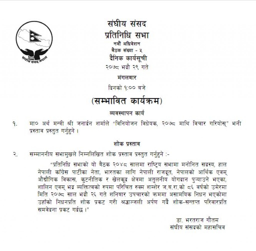 प्रतिनिधिसभाको बैठक आज बस्दै