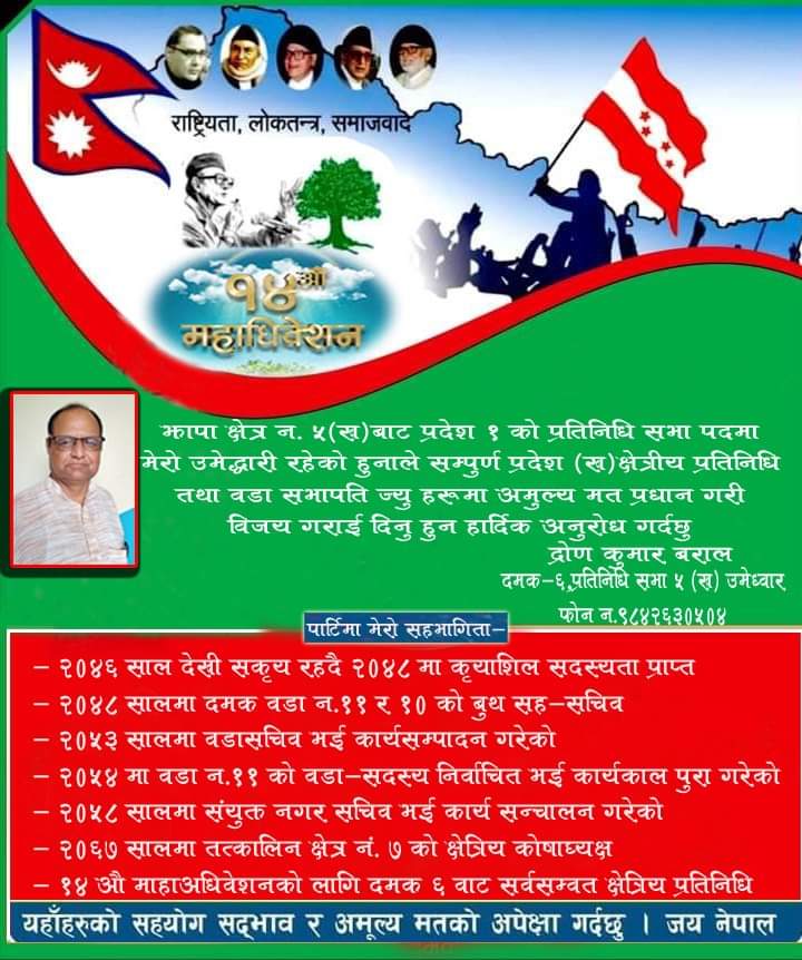 झापा क्षेत्र न. ५ (ख) बाट प्रदेश १ को प्रतिनिधि सभा पदमा द्रोण कुमार बरालको उमेद्धारी